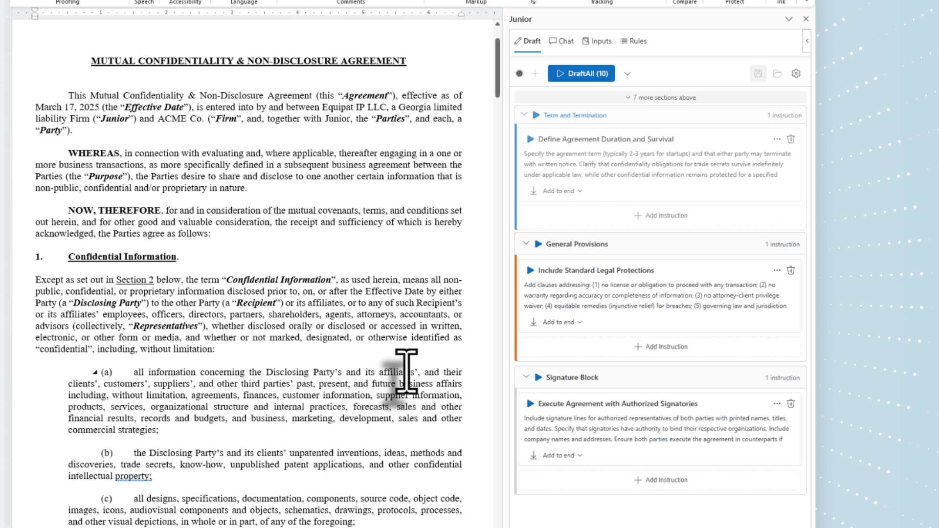 AI agents draft complete documents from your parameters, ready for review and customization.