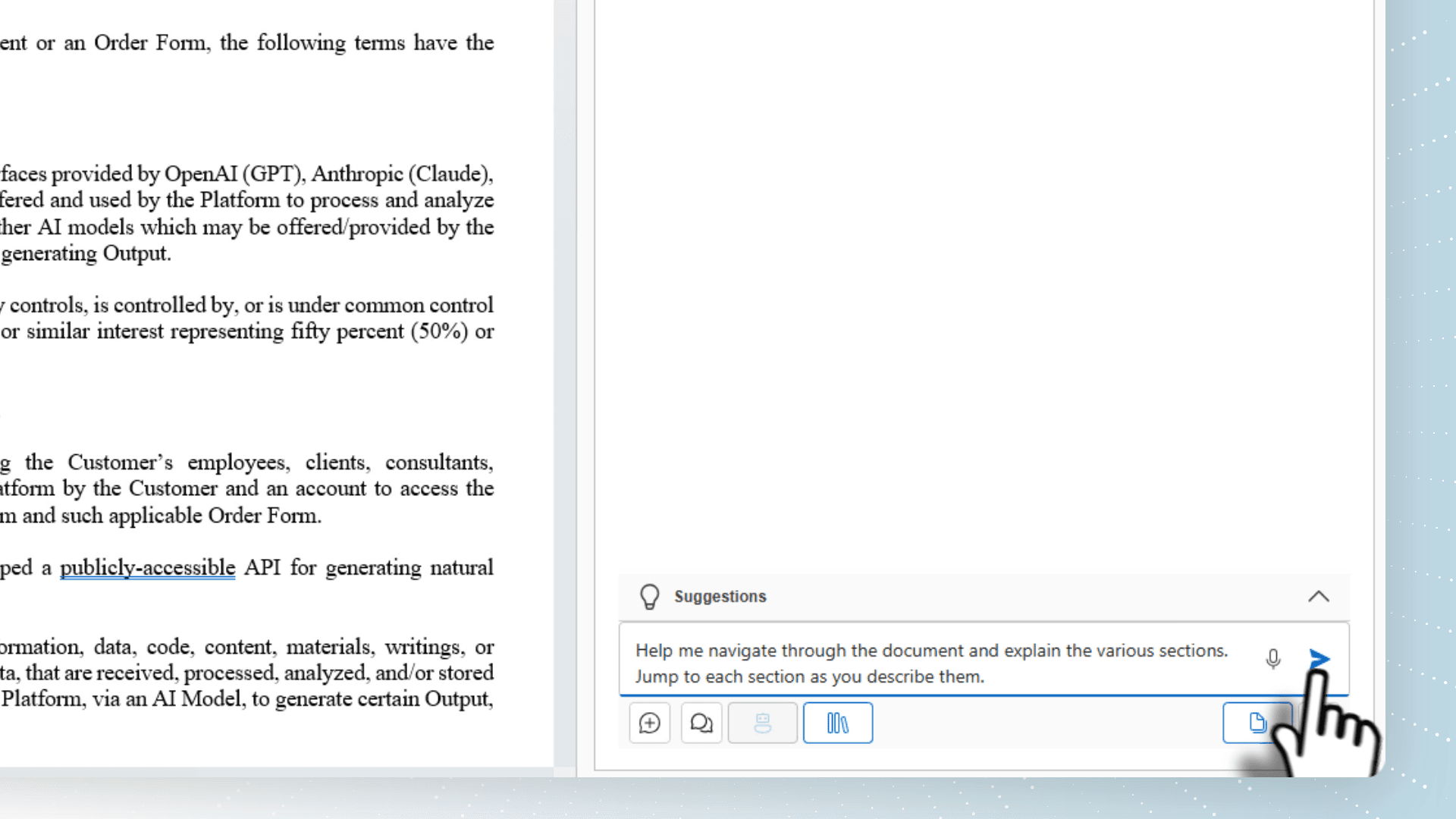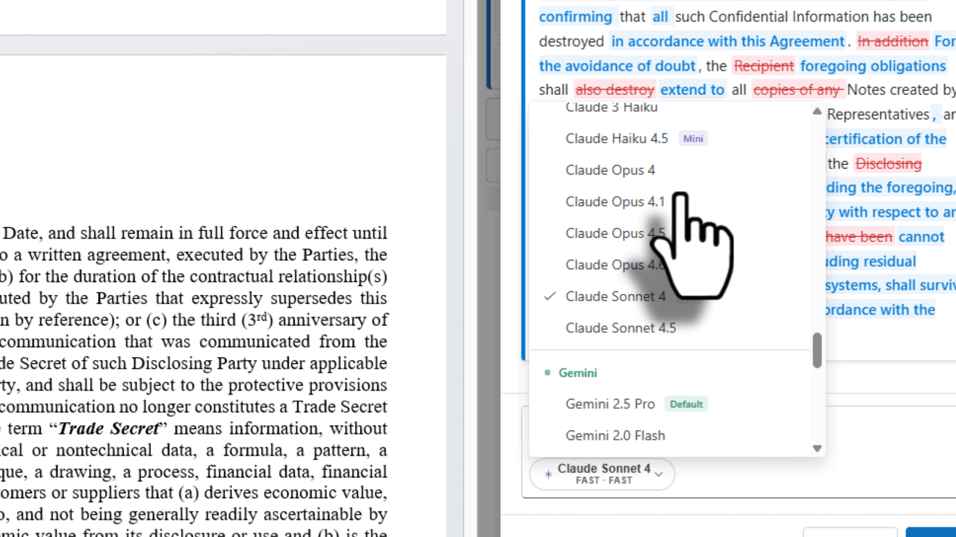 Swap models, run parallel analyses, and surface risks and gaps in seconds — never leaving the document you're drafting.
