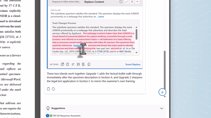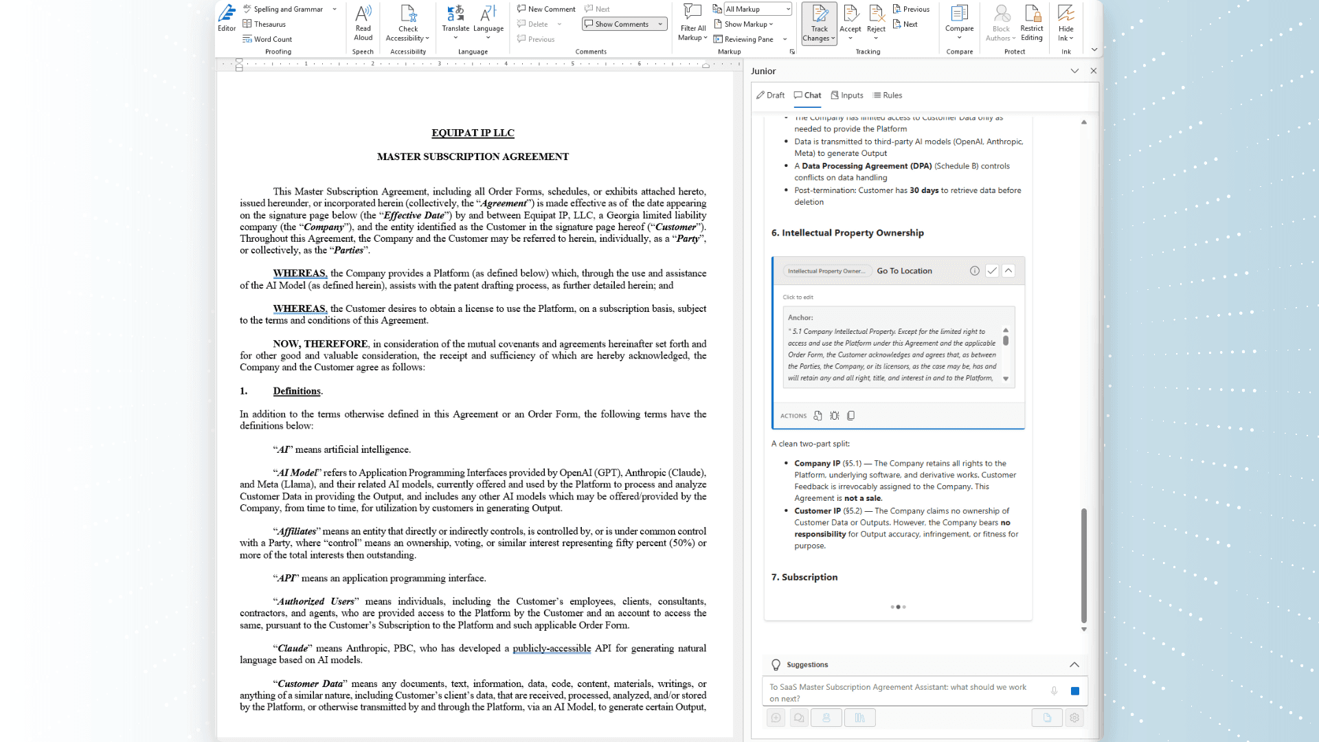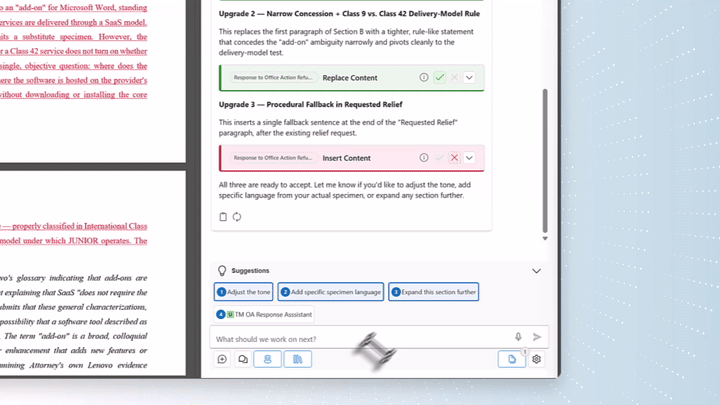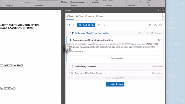 Converse with your document. Ask Junior to tighten a clause, draft a new section, or align the tone to your firm's prior filings.