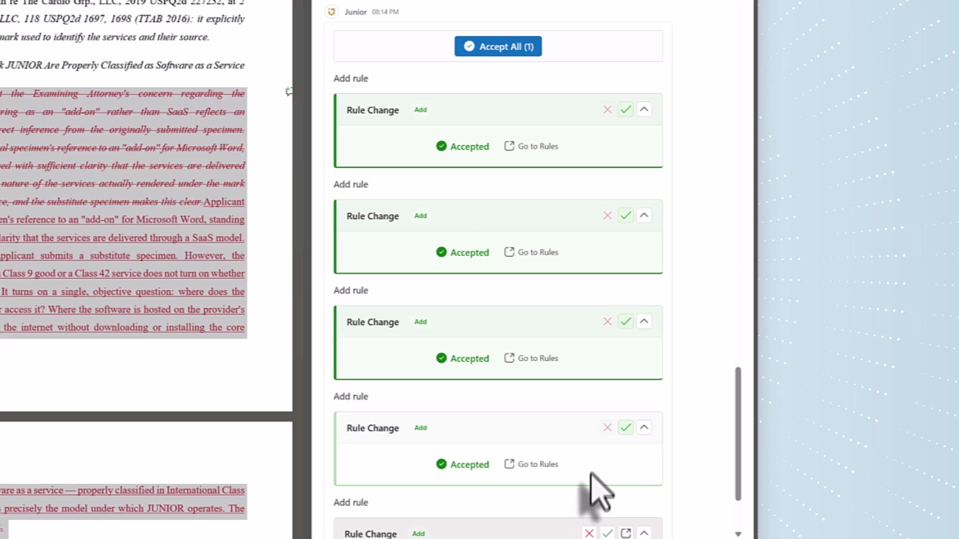 You're always in control. JR3 surfaces patterns from your prior work — how you've structured similar office action responses, which argument frameworks you've used in past oppositions, how you typically organize goods descriptions. You decide what to keep. It's a drafting assistant that remembers your approach, not a system that overrides your judgment.