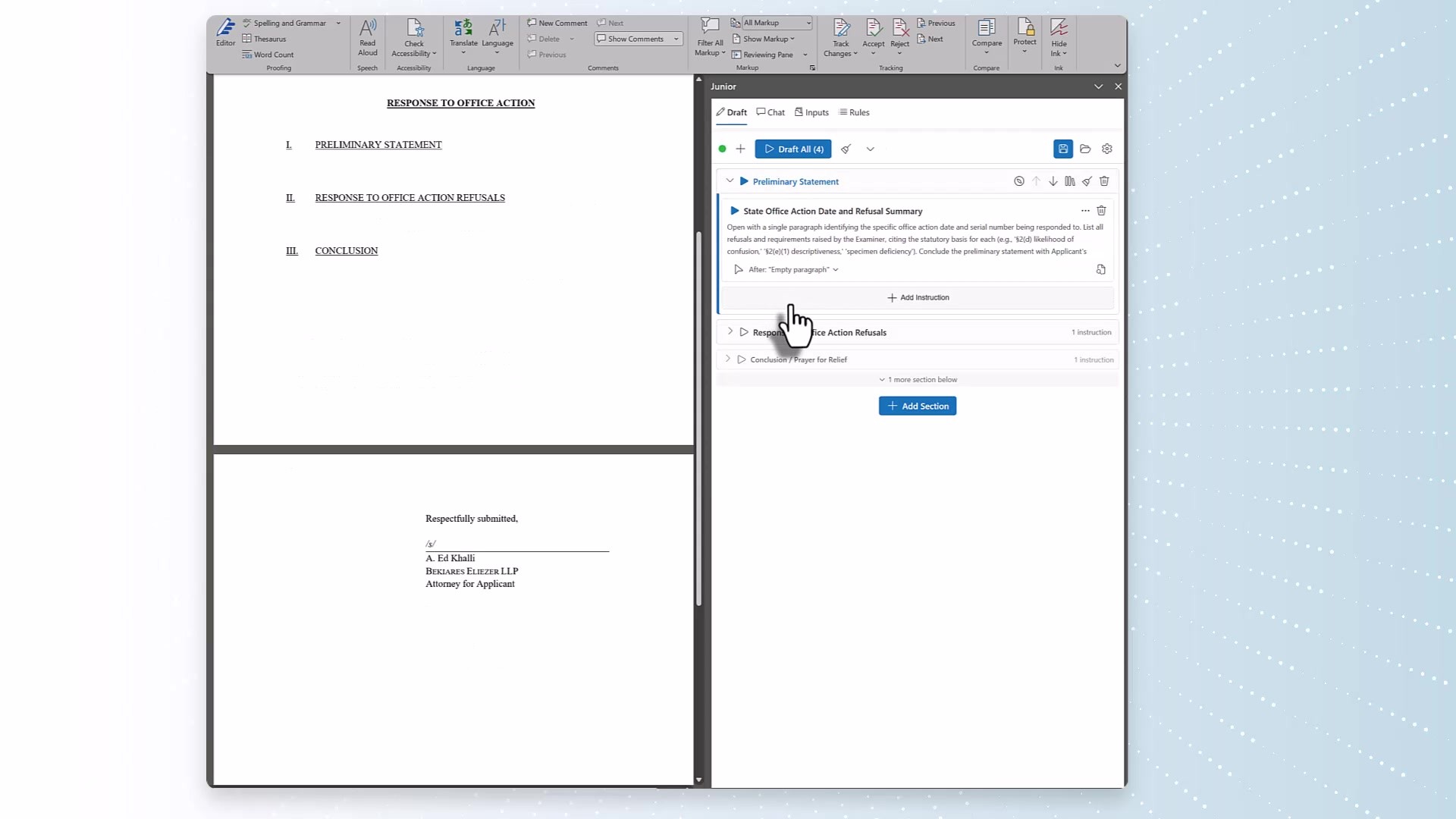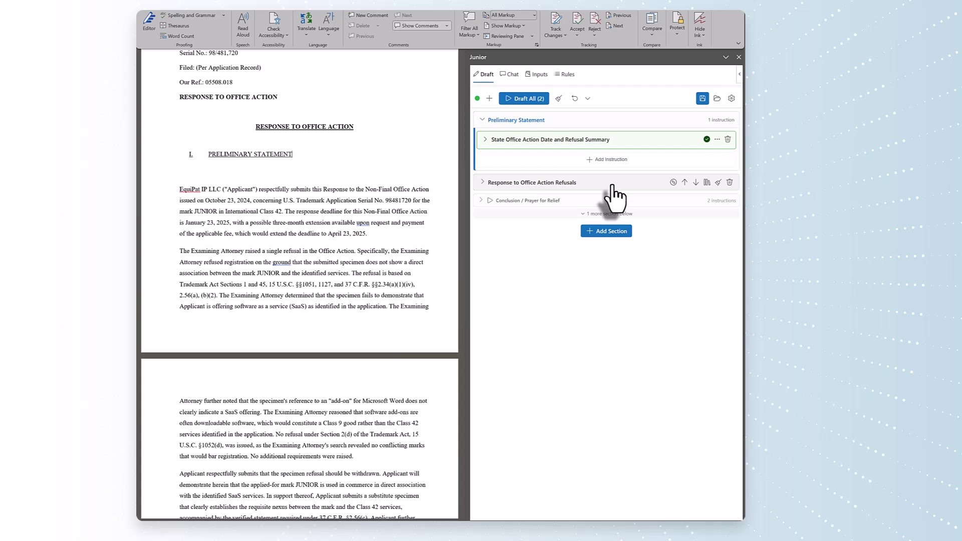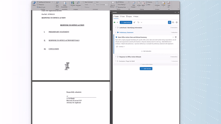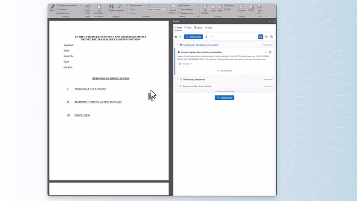 ChatGPT writes a draft. Then what? JR3 picks up where generic AI falls short by structuring, refining, and finalizing trademark documents to your exact standards, right inside the tools you already use. Start in ChatGPT, Claude, or directly in your document. Junior picks up from there. Review, refine, and finalize without ever leaving Word or Google Docs.